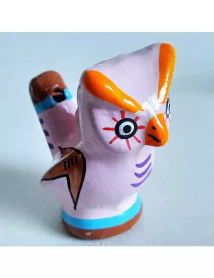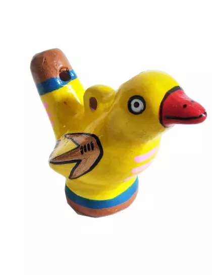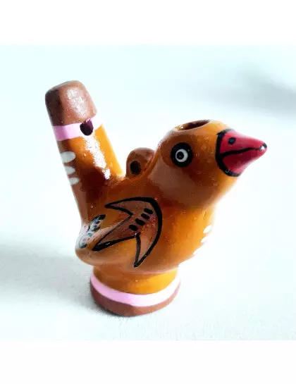 Descrição: Apito de cerâmica em formato de pássaro. Possui grafismos coloridos típicos da região andina do Peru. É um item perfeito para quem procura um item decorativo ou uma lembrança para presente. Para utilizá-lo, basta preencher o apito com água e após isso assoprar. Assim que sair o excesso de água o apito começará a emitir seu som característico.