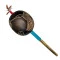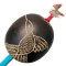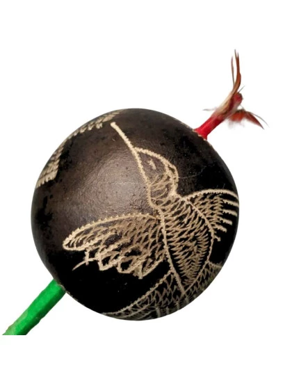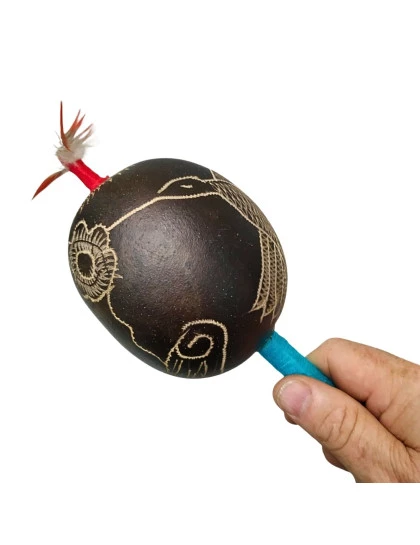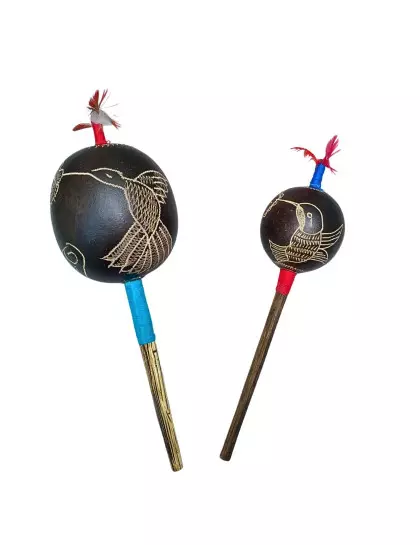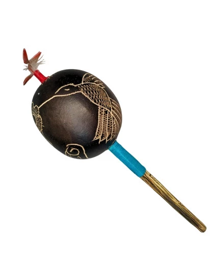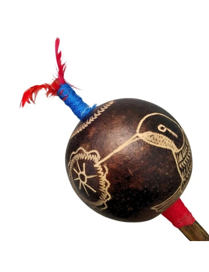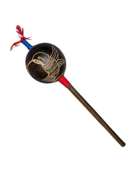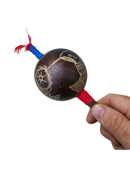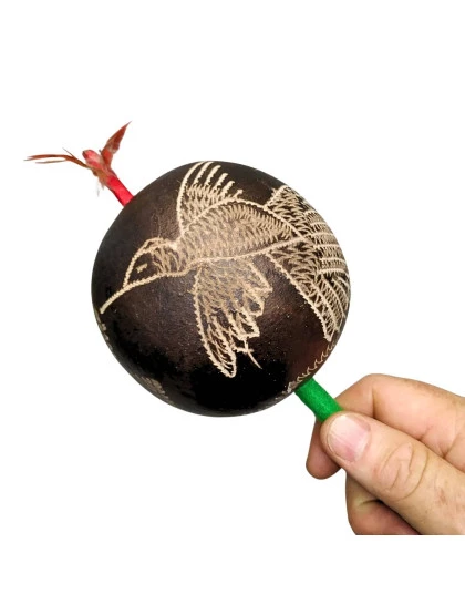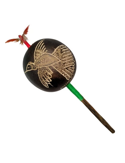 DESCRIÇÃO: Maracá de cabaça muito comum na Amazônia Peruana, feito artesanalmente pelos indígenas shipibo do Peru, com cabo de madeira tucum. De um lado da cabaça está entalhado um pássaro beija-flor e do outro lado está entalhado animais variados como, águia ou serpente. Utilizado em cerimônias de pajelança e cantorias de cura e com desenhos que se referem aos elementos da natureza.