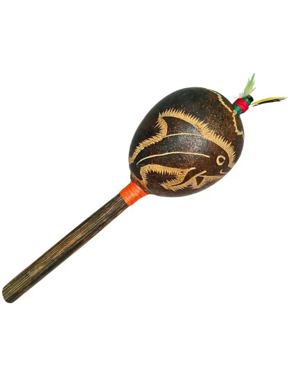 DESCRIÇÃO: Maracá de "wingo", cabaça muito comum na Amazônia Peruana, feito artesanalmente pelos indígenas shipibo do Peru. Utilizado em cerimônias de pajelança e cantorias de cura.