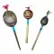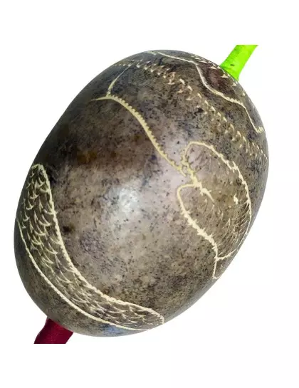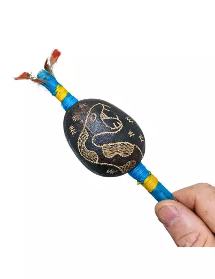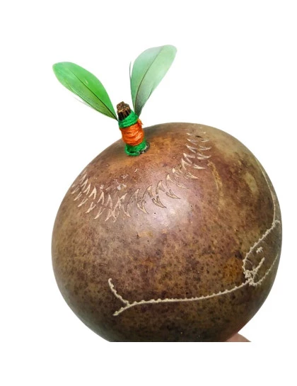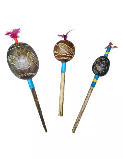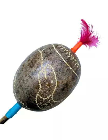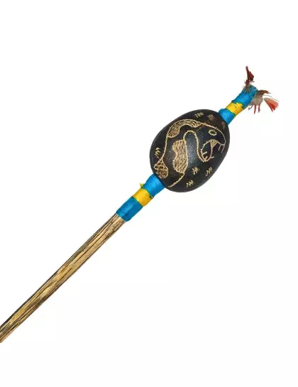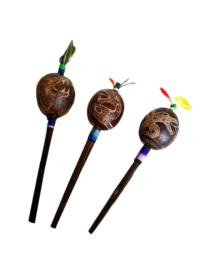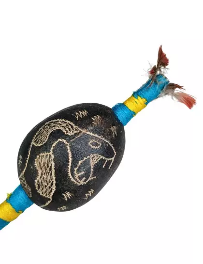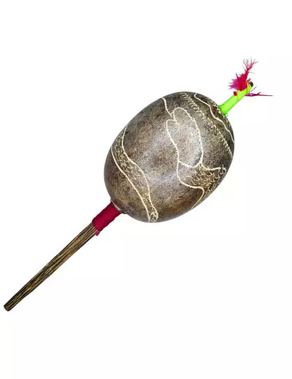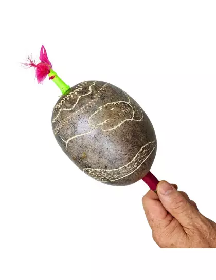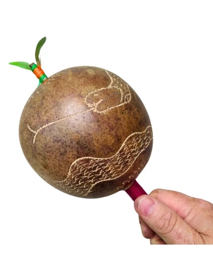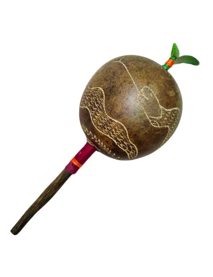 DESCRIÇÃO: Maracá de cabaça muito comum na Amazônia Peruana, feito artesanalmente pelos indígenas shipibo do Peru, com cabo de madeira tucum. Toda a cabaça está entalhada em sua volta uma serpente. Utilizado em cerimônias de pajelança e cantorias de cura e com desenhos que se referem aos elementos da natureza.