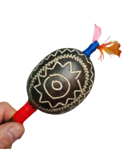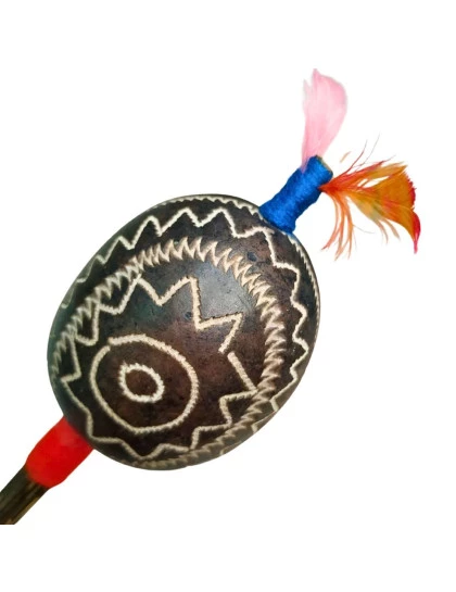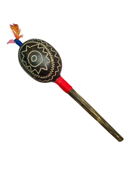 DESCRIÇÃO: Maracá de "wingo", cabaça muito comum na Amazônia Peruana, feitos artesanalmente pelos indígenas shipibo do Peru. Utilizado em cerimônias de pajelança e cantorias de cura. O maraca xamânico é um instrumento muito forte para se levar em rodas e rituais. Essa Maraca xamânica, possui um sol em sua lateral e detalhes em linha e penas.